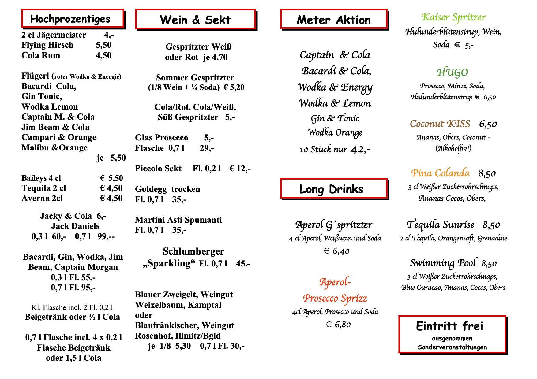 Lassen Sie sich von unseren kühlen Getränken verwöhnen. Am 31. Dezember haben wir wieder unsere legendäre Silvesterparty, wenn Sie dabei sein möchten, bitte so bald wie möglich reservieren, wir sind jedes Jahr aasreserviert!
